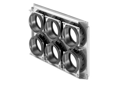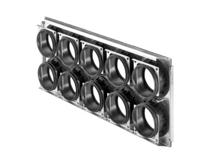 Dvouřadý rozdělovací box pro distribuci vzduchu v rekuperačním systému vyvinutý a vyrobený v České republice pro potrubí o průměru 75 mm