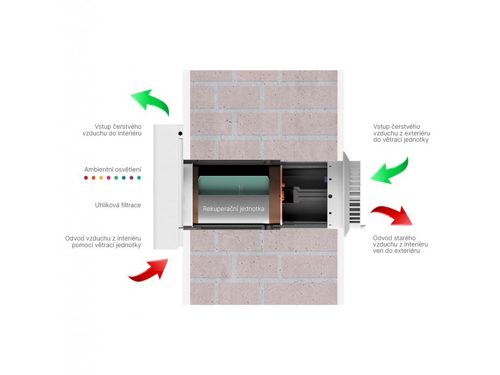 Jednotka s rekuperací vzduchu umožňuje automaticky řízené větrání. Kontinuálně odvádí vydýchaný vzduch z interiéru ven a současně přivádí čerstvý vzduch přes systém filtrace do interiéru. V zimě uvnitř jednotky odváděný vzduch z interiéru ohřívá čerstvý vzduch zvenku který jednotka přivádí. V létě je to naopak.