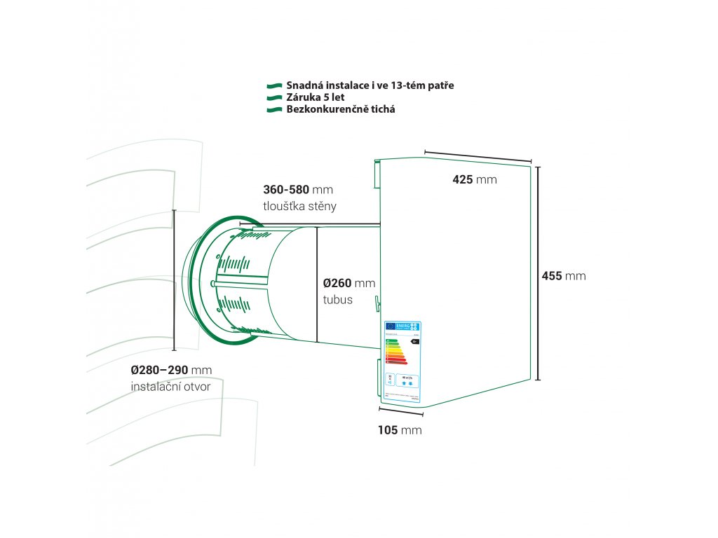 Jako jediná větrací jednotka na trhu zvládne provoz v mrazu až do -17 °C bez předehřevu se spotřebou do max 20W a navíc se stará o správnou vlhkost ve větraném prostoru bez kondenzátu. Hlučnost je maximálně 28dB, takže o chodu jednotky téměř nebudete vědět.